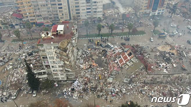 (카흐라만마라스 로이터=뉴스1) 최종일 기자 = 6일(현지시간) 규모 7.8의 강진이 튀르키예 남동부 지역을 강타한 가운데 카흐라만마라스에 있는 건물들이 붕괴되거나 크게 훼손됐다.