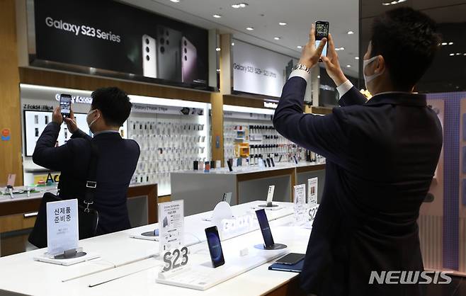 [서울=뉴시스] 조수정 기자 = 삼성전자와 SK텔레콤, KT, LG유플러스 등 이동통신 3사의 갤럭시 S23 시리즈 사전예약이 시작된 7일 서울 서초구 삼성 딜라이트샵에서 방문객들이 갤럭시 S23를 살펴보고 있다. 2023.02.07. chocrystal@newsis.com