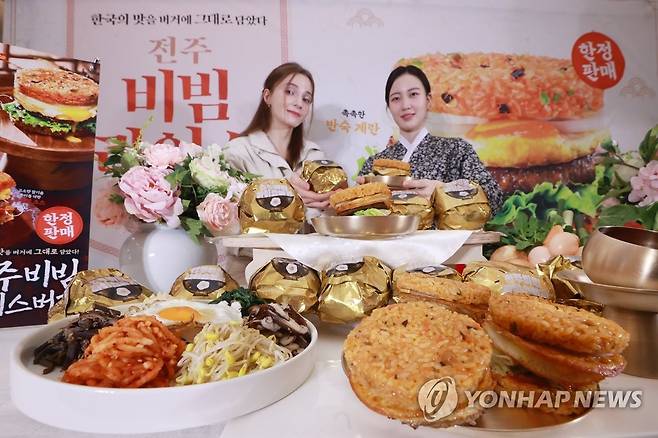 (서울=연합뉴스) 진연수 기자 = 7일 오전 서울 마포구 롯데리아 홍대점에서 모델들이 롯데리아 신제품 '전주비빔라이스버거'를 선보이고 있다. 이번 신제품은 2016년 11월 단종 이후 약 7년만에 새롭게 출시된 라이스버거 라인 제품으로 한국 대표 전통음식 비빔밥을 버거로 재해석했다. 2023.2.7