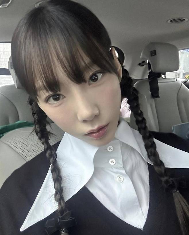 인스타그램에 웬즈데이와 똑 닮은 양갈래 머리에 커다란 칼라의 의상을 입고 찍은 사진을 올린 태연. 팬들은 “완전 탱즈데이”, “태연 진짜 웬즈데이 같아” 등의 반응을 댓글로 남겼습니다.