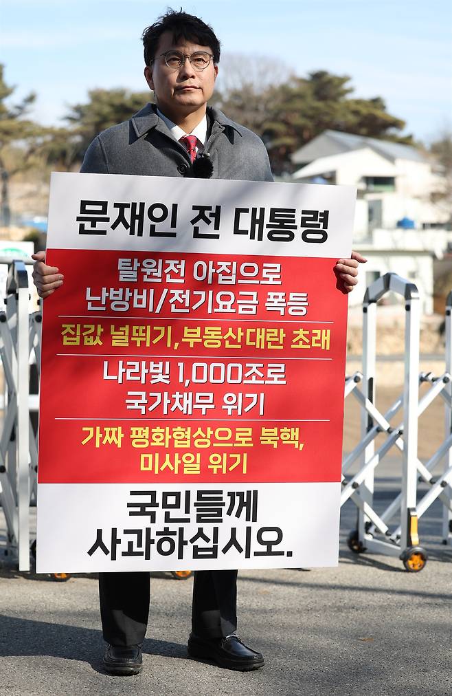 그가 든 손팻말에는 문 전 대통령을 향한 사과 촉구와 함께 "탈원전 아집으로 난방비/전기요금 폭등", "집값 널뛰기, 부동산 대란 초래", "가짜 평화협상으로 북핵, 미사일 위기" 등이 적혀 있었다.