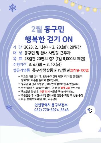 2월 동구민 행복한 걷기 ON 챌린지는 28일까지 20만 보 걷기(1일 8,000보까지 인정)에 성공한 걷기우수자를 대상으로 선착순 100명에게 동구사랑상품권 1만 원 1매를 지급할 예정이다.
