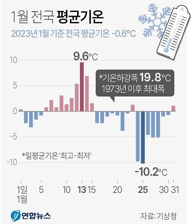 1월 내의 기온 하강폭은 1973년 이래 최대치를 기록했다. 지난달 가장 기온이 높았던 13일의 전국 평균기온은 9.6도였고 제일 추웠던 25일의 전국 평균기온은 영하 10.2도였다. 두 날의 평균기온 차는 19.8도로 역대 1위로 기록됐다. 1973년은 기상 관측망이 전국에 확충돼 기상기록의 기준이 되는 해다.
