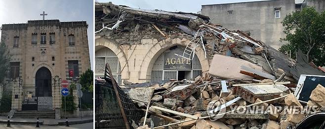 (서울=연합뉴스) 6일(현지시간) 튀르키예에서 규모 7.8과 7.5의 강진이 연이어 발생한 가운데 튀르키예 하타이주 안타키아 소재 기독교대한감리회 산하 한국인 선교사가 파견된 안디옥 개신교회가 붕괴(오른쪽)돼 있다. 사진 왼쪽은 지진 발생 전인 2018년 연합뉴스 특파원이 촬영한 안디옥 개신교회의 모습. [연합뉴스·기독교대한감리회 제공, 재판매 및 DB 금지]
