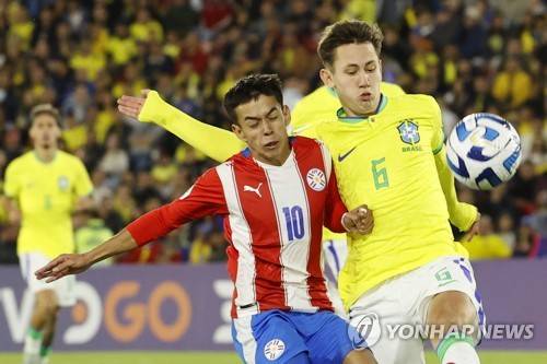 epa10451906 Matias Segovia (L) of Paraguay vies for the ball with Patryck Lanza of Brazil during the South American U-20 soccer match between Paraguay and Brazil at El Campin stadium in Bogota, Colombia, 06 February 2023. EPA/Mauricio Duenas Castaneda