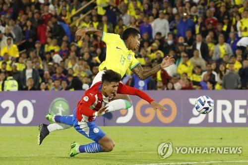 epa10451903 Diego Gonzalez (L) of Paraguay in action with Andre Dhominique of Brazil during the South American U-20 soccer match between Paraguay and Brazil at El Campin stadium in Bogota, Colombia, 06 February 2023. EPA/Mauricio Duenas Castaneda EPA-EFE/Mauricio Duenas Castaneda