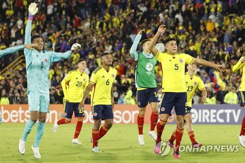 epa10451933 Colombia players celebrate after winning against Ecuador during the South American U-20 soccer match between Colombia and Ecuador at El Campin stadium in Bogota, Colombia, 06 February 2023. EPA/Mauricio Duenas Castaneda