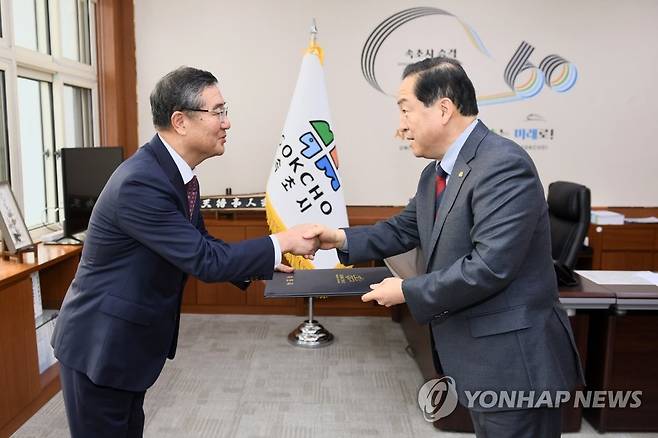 (속초=연합뉴스) 이병선 속초시장(오른쪽)이 7일 오전 집무실에서 김태균 신임 속초시시설관리공단 이사장에게 임명장을 수여하고 있다.