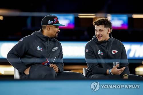 epaselect epa10451830 Philadelphia Eagles quarterback Jalen Hurts (L) speaks with Kansas City Chiefs quarterback Patrick Mahomes (R) during the National Football League's Super Bowl LVII Opening Night event at the Footprint Center in Phoenix, Arizona, USA, 06 February 2023. The AFC champion Kansas City Chiefs face the NFC champion Philadelphia Eagles in Super Bowl LVII at State Farm Stadium in Glendale, Arizona, 12 February 2023. EPA/CAROLINE BREHMAN