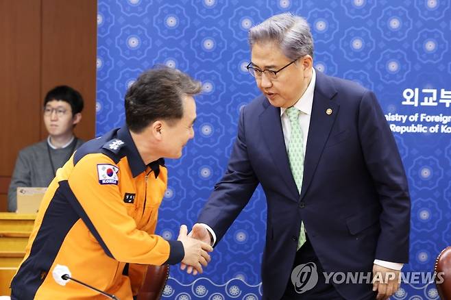 (서울=연합뉴스) 황광모 기자 = 박진 외교부 장관이 7일 오후 서울 종로구 외교부 내 상황실에서 열린 튀르키예 지진피해 민관합동 해외지원협의회에서 남화영 소방청장 직무대리와 악수하고 있다. 2023.2.7
