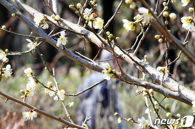 (제주=뉴스1) 오현지 기자 = 제주지역 낮 최고기온이 16도를 넘어선 7일 오후 제주시 한라수목원에 매화가 펴 시선을 사로잡고 있다. 2023.2.7/뉴스1