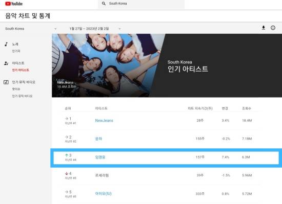 1월 27일 – 2월 2일 한국 유튜브 뮤직 차트에 따르면, 임영웅은 주간 인기 아티스트 차트서 전체 3위를 차지했다.