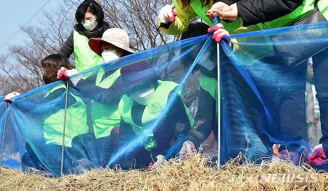 [대구=뉴시스] 이무열 기자 = 7일 오후 대구 수성구 욱수동 망월지에서 수성구청 직원과 자연보호대구시협의회 자원봉사자들이 두꺼비 로드킬 방지 펜스를 설치하고 있다. 전국 최대 두꺼비 산란지인 망월지에는 매년 2, 3월쯤 두꺼비 수천여 마리가 욱수골에서 내려와 알을 낳고 있다. 2023.02.07. lmy@newsis.com