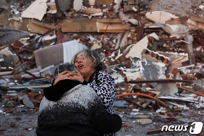 (하타이 로이터=뉴스1) 박재하 기자 = 7일 튀르키예(터키) 남동부 하타이에서 강진으로 무너진 건물 앞에서 시민들이 서로 껴안으며 통곡하고 있다. 이번 지진으로 튀르키예와 시리아에서 집계된 사망자 수는 4300명을 훌쩍 넘기고 있다.