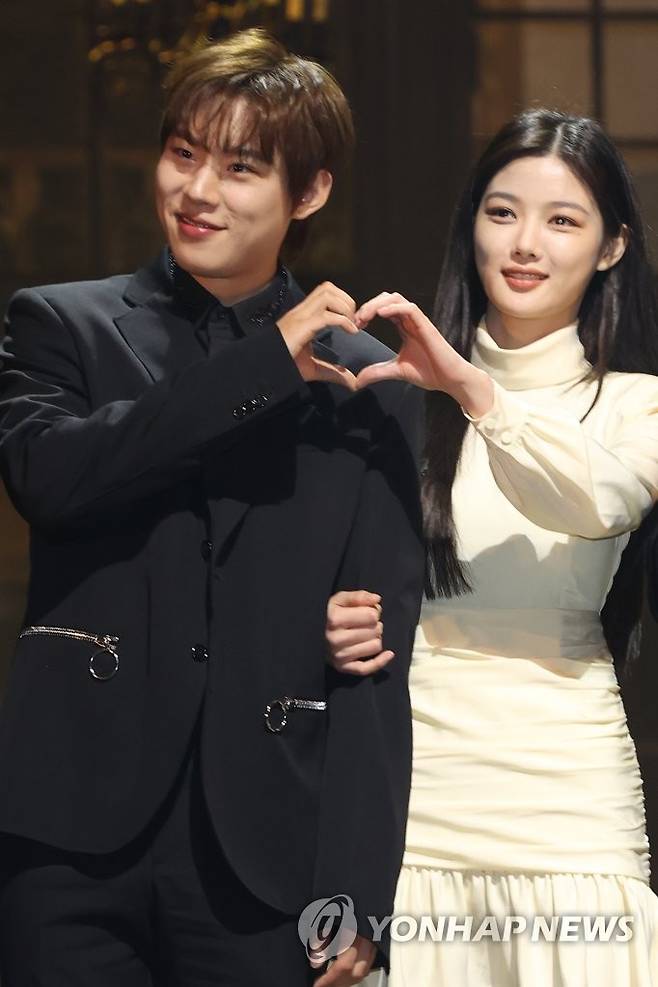 (서울=연합뉴스) 강민지 기자 = 7일 오후 서울 서초구 예술의전당 CJ토월극장에서 열린 연극 '셰익스피어 인 러브' 기자간담회에서 배우 김성철 김유정이 포즈를 취하고 있다. 2023.2.7