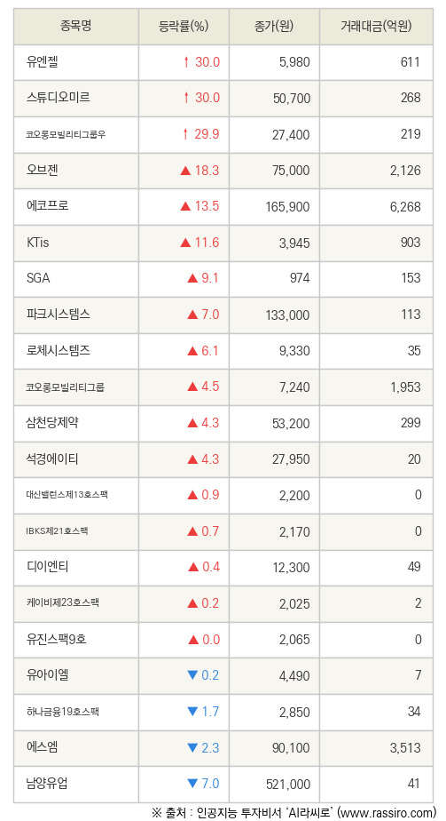 특히 유엔젤은 전 거래일 대비 30.0% 오른 5,980원에 거래를 마감하여 높은 관심을 받았다.
