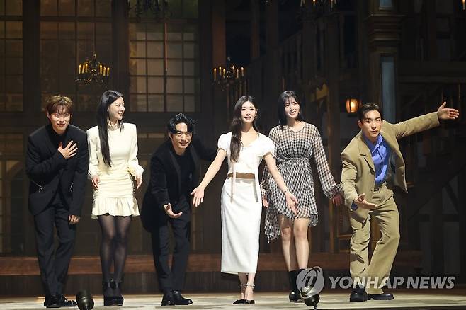 (서울=연합뉴스) 강민지 기자 = 7일 오후 서울 서초구 예술의전당 CJ토월극장에서 열린 연극 '셰익스피어 인 러브' 기자간담회에서 배우들이 포즈를 취하고 있다.