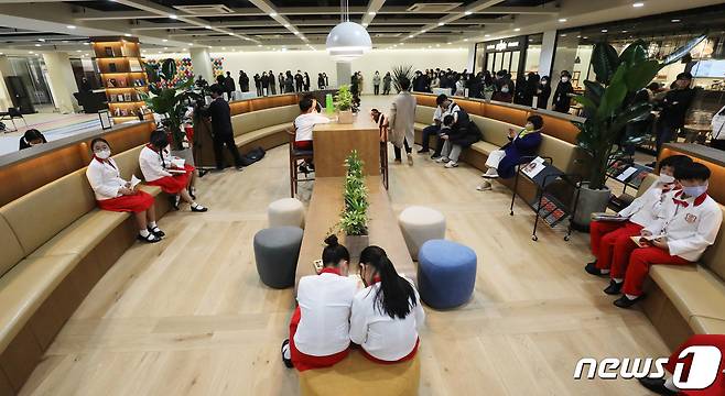 (서울=뉴스1) ,송원영 기자 = 7일 서울 종로구 세종문화회관 1층에서 열린 북카페형 편의 공간 '세종라운지' 개장식에서 학생들이 책을 읽고 있다.