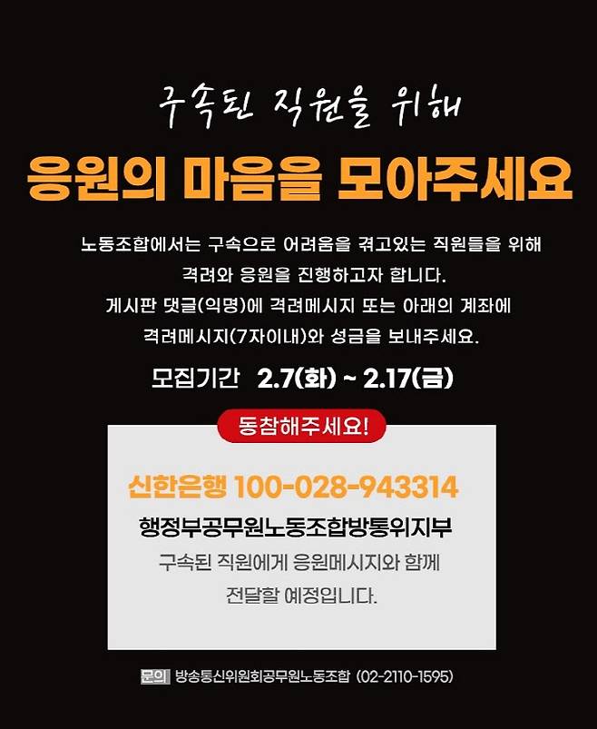 또, ‘2020년 TV조선 재승인 심사 점수 조작’ 혐의로 방통위 담당 국장과 과장이 구속되면서 방통위 공무원 노동조합이 ‘구속된 직원을 위해 응원의 마음을 모아주세요’라는 응원메시지와 모금캠페인을 전개하고 있다.