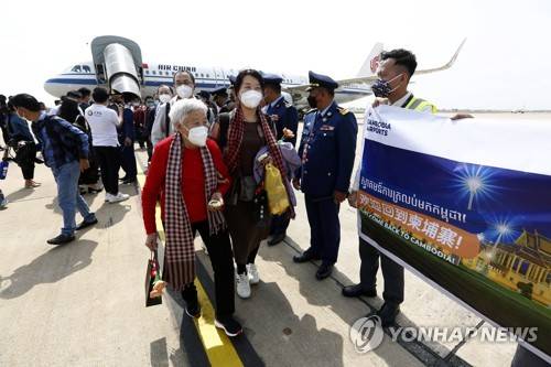 epa10452032 Chinese tourists upon arrival during a welcoming ceremony at Phnom Penh International Airport in Phnom Penh, Cambodia, 07 February 2023. The first group tour of Chinese tourists, after three years hiatus due to COVID-19, arrived in Phnom Penh on 07 February. EPA/KITH SEREY