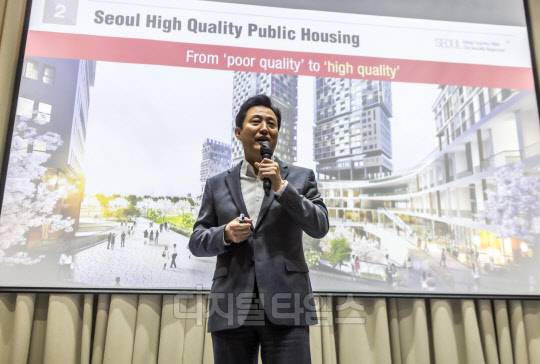 오세훈 서울시장이 7일 중구 시청에서 열린 2023년 서울주재 외신기자 간담회에서 '동행 매력 특별시 서울'을 주제로 발표하고 있다.