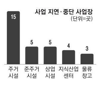 착공 후 문제가 생겨 공사가 지연된 현장은 25곳, 공사가 중단돼 사업 자체가 어그러질 위기에 놓인 현장은 7곳에 달했다. 협회 관계자는 7곳에 대해 "PF실행이 불가한 것으로 결정돼 사업이 중단된 곳들"이라고 설명했다. 32개 현장 중엔 아파트 등 주거시설 공사 현장이 15곳으로 가장 많았고 △오피스텔 등 준주거시설(5곳) △상업시설(5곳) △지식산업센터(4곳) △물류창고(3곳) 등도 다수 있었다. 공사가 아예 중단된 현장 역시 주거시설(5곳)이 가장 많았고, 준주거시설과 상업시설이 각각 한 곳씩 있는 것으로 나타났다.