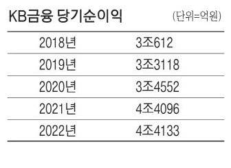 KB금융은 지난해 당기순이익으로 4조4133억원을 기록했다고 7일 발표했다. 기존 역대 최대 기록이었던 2021년 4조4096억원보다 소폭(0.1%) 늘었다. 이로써 KB금융은 2020년부터 2022년까지 3년 연속 최대 순이익 기록 경신 행진을 이어갔다. KB금융 관계자는 "주식시장 침체와 금융시장 변동성 확대로 어려운 영업환경 속에서 여신 성장과 순이자마진(NIM) 확대에 힘입어 순이자이익이 견조하게 증가했다"고 말했다.
