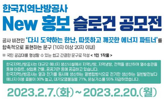 한국지역난방공사는 새로운 홍보 슬로건 발굴을 위한 '뉴(New) 홍보 슬로건 공모전'을 시행한다고 7일 밝혔다.