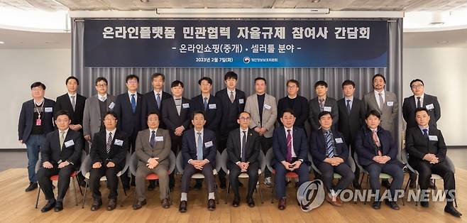 (서울=연합뉴스) 고학수 개인정보보호위원회 위원장이 7일 서울 송파구 롯데월드타워 롯데온에서 열린 온라인플랫폼 민관협력 자율규제 참여사업자 대상 간담회에서 참여사 대표들과 기념 촬영하고 있다. 2023.2.7 [개인정보보호위원회 제공. 재판매 및 DB 금지]