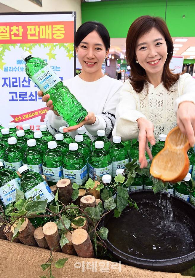 [이데일리 김태형] 7일 서울 서초구 하나로마트 양재점에서 모델들이 지리산 피아골에서 채취한 고로쇠 수액을 선보이고 있다.