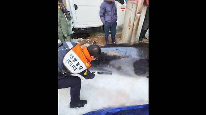 사진을 국립수산과학원 고래연구센터에 보낸 결과, 해양 보호 생물종에는 해당하지 않는 밍크고래로 밝혀져 위판장에서 6천만 원에 팔렸습니다.