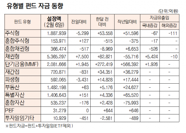 [데이터로 보는 증시]유형별 펀드 자금 동향(2월 6일)
