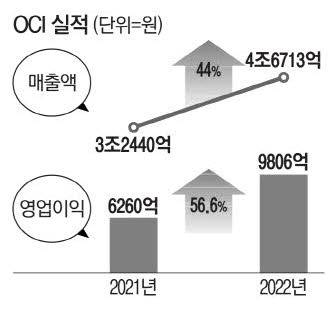 OCI가 연결기준 지난해 영업이익이 9806억원으로 전년 대비 56.6% 증가했다고 7일 공시했다. 같은 기간 매출은 44% 늘어난 4조6713억원, 순이익은 34.7% 증가한 8784억원으로 집계됐다. 지난해 폴리실리콘 판매 가격 상승과 판매량 증가에 따라 2012년 이후 최대 규모 실적을 달성했다고 OCI는 밝혔다. OCI는 "러시아·우크라이나 전쟁이 장기화되고 에너지안보 위기 의식이 커지면서 전 세계 태양광발전 수요가 증가했다"며 "이에 따라 회사의 주요 품목인 폴리실리콘 가격이 올라 실적을 견인했다"고 설명했다.