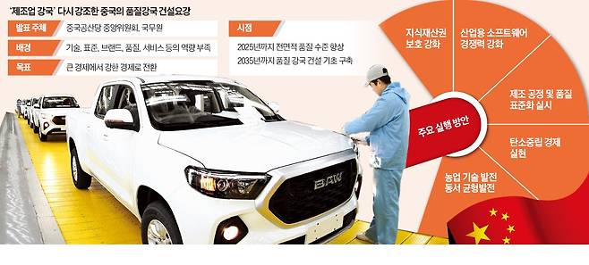 발표 주체인 공산당 중앙위는 장관급 이상 200여 명으로 구성된 중국 공산당의 핵심 기구다. 강요는 공산당의 중장기 정책 가이드라인이다. 지난해 10월 20차 당대회에서 새로 구성된 중앙위가 품질을 강조한 산업정책 가이드라인을 내놓은 것은 향후 정부 정책이 제조업을 비롯한 산업 품질 강화에 초점을 맞출 것이란 신호로 해석된다.