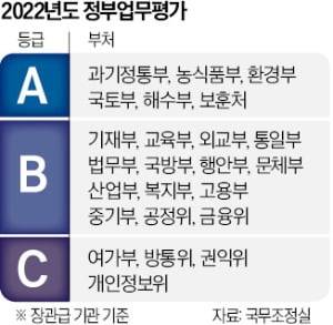 부문 평가를 합산한 종합평가 결과를 보면 장관급 기관 중 과학기술정보통신부 농림축산식품부 환경부 국토교통부 해양수산부 국가보훈처 등이 A등급을 받았다.