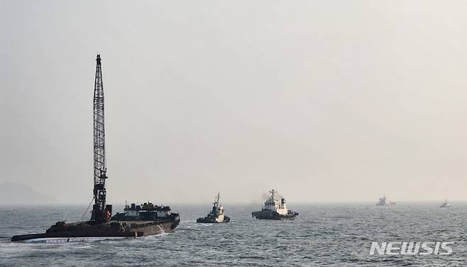 [목포=뉴시스] 이영주 기자 = 24t급 연안통발어선 청보호가 7일 목포해경 예인선을 통해 인양 목표 지점으로 이동하고 있다. (사진 = 목포해양경찰서 제공) 2023.02.07. photo@newsis.com