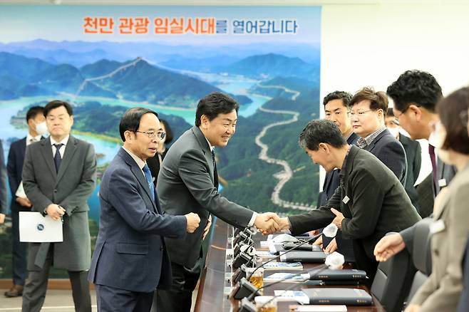 임실군 실국장과 인사 나누는 김관영 전북도지사