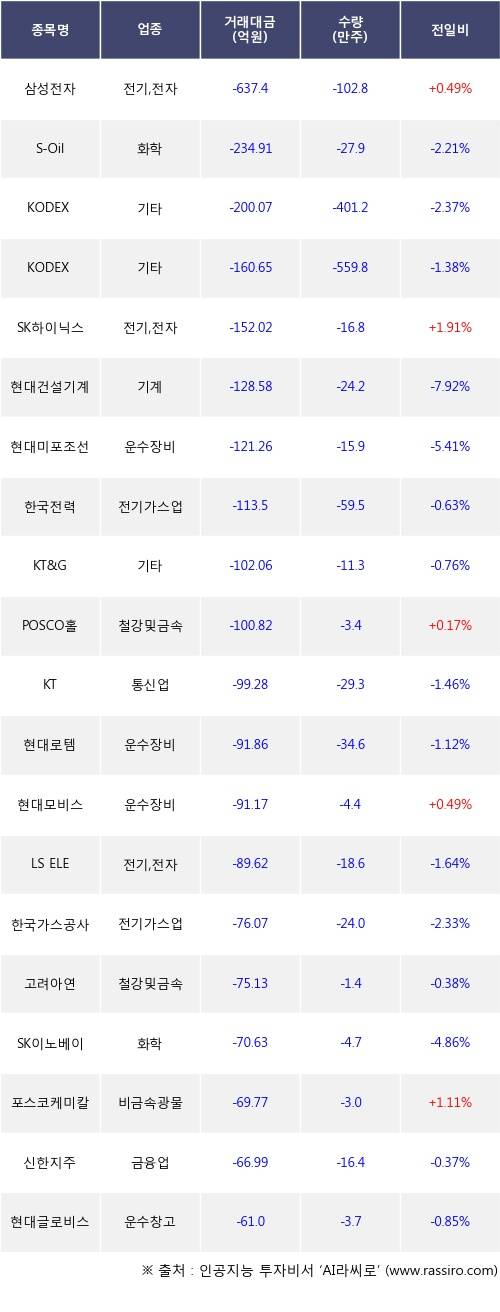기관 투자자의 순매도 상위 20개 종목은 삼성전자, S-Oil, KODEX 코스닥150선물인버스, KODEX 200선물인버스2X, SK하이닉스, 현대건설기계, 현대미포조선, 한국전력, KT&G, POSCO홀딩스등이다.