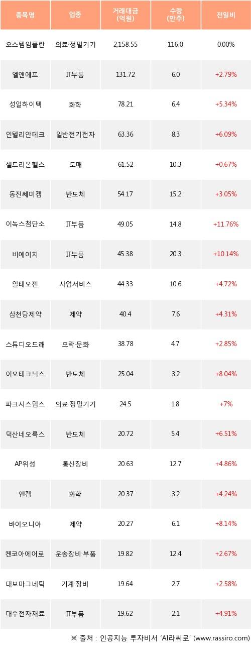 기관 투자자의 순매수 상위 20개 종목은 오스템임플란트, 엘앤에프, 성일하이텍, 인텔리안테크, 셀트리온헬스케어, 동진쎄미켐, 이녹스첨단소재, 비에이치, 알테오젠, 삼천당제약등이다.