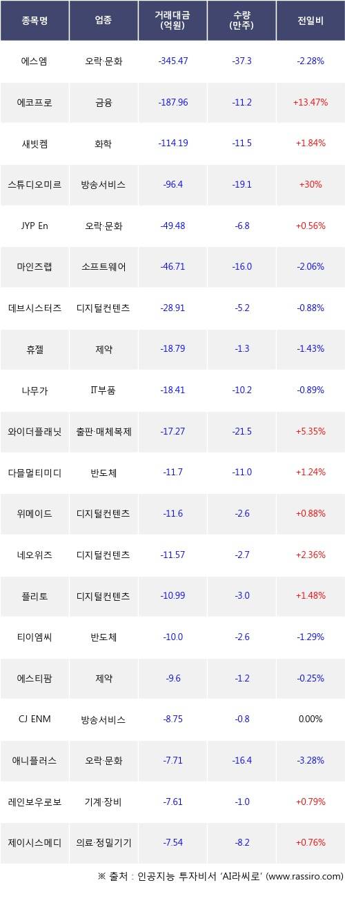 기관 투자자의 순매도 상위 20개 종목은 에스엠, 에코프로, 새빗켐, 스튜디오미르, JYP Ent., 마인즈랩, 데브시스터즈, 휴젤, 나무가, 와이더플래닛등이다.