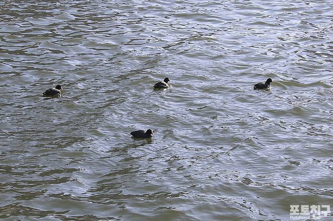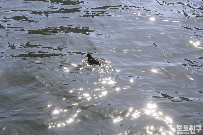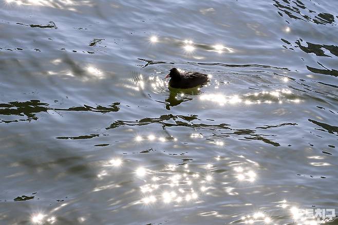 헤엄치는 물닭도 반짝반짝 빛이 납니다.