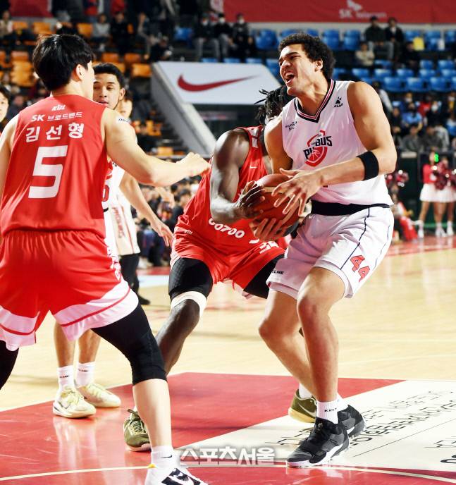 울산 현대모비스 프림이 7일 잠실학생체육관에서 열린 2022-2023 프로농구 서울 SK와 경기에서 상대 파울에 괴로워하고 있다.