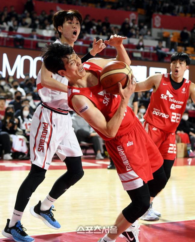 서울 SK 김선형이 7일 잠실학생체육관에서 열린 2022-2023 프로농구 울산 현대모비스와 경기에서 볼을 지키고 있다.