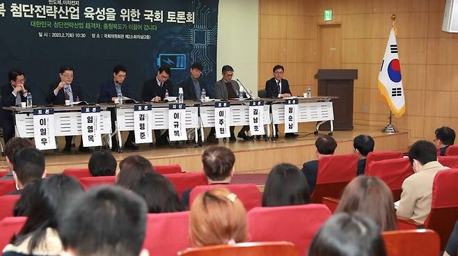 [청주=뉴시스] 이병찬 기자 = 국회의회원에서 7일 열린 충북 첨단전략산업 육성을 위한 토론회에서 토론자들이 의견을 교환하고 있다.(사진=충북도 제공) 2023.02.07. photo@newsis.com
