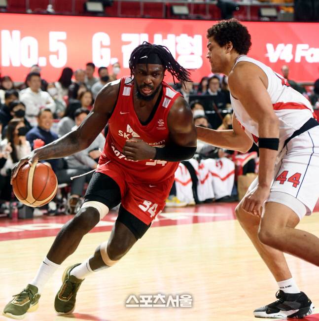 서울 SK 자밀 워니가 7일 잠실학생체육관에서 열린 2022-2023 프로농구 울산 현대모비스와 경기에서 드리블을 하고 있다.