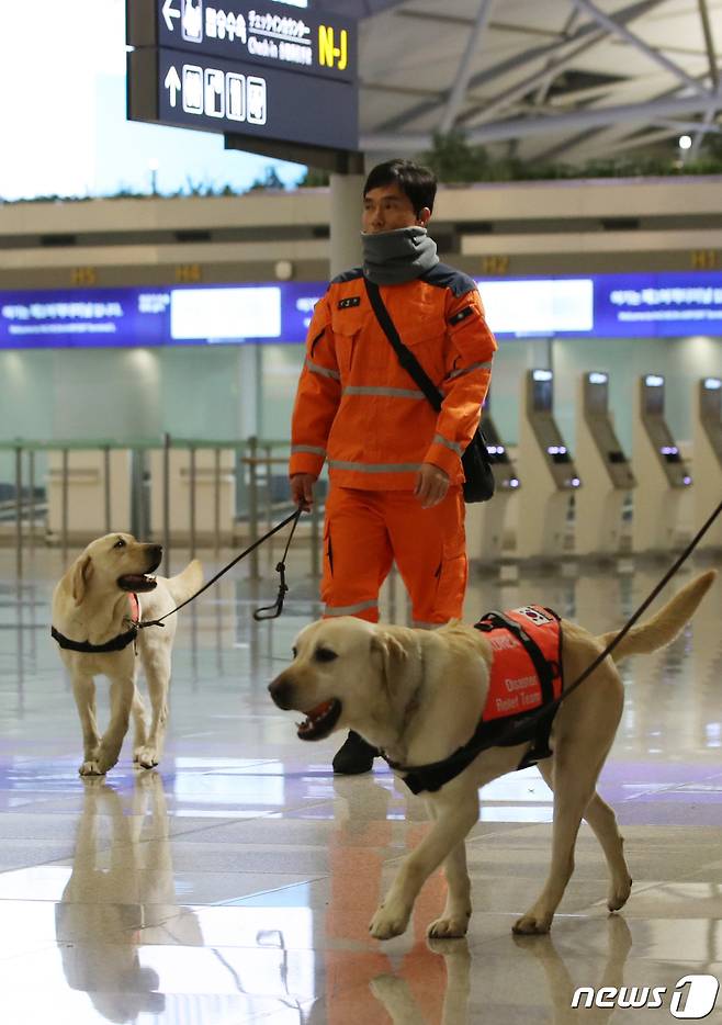 (인천공항=뉴스1) 구윤성 기자 = 튀르키예 지진 실종자 수색 등을 위한 대한민국 긴급구호대(KDRT) 대원과 수색견이 7일 오후 인천국제공항 제1여객터미널에 집결하고 있다.