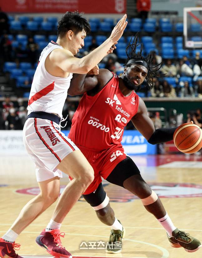 서울 SK 자밀 워니가 7일 잠실학생체육관에서 열린 2022-2023 프로농구 울산 현대모비스와 경기에서 수비를 뚫고 있다.