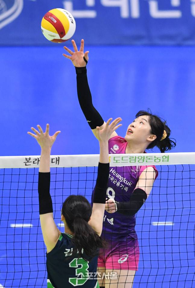 흥국생명 김미연(오른쪽)이 7일 수원체육관에서 열린 2022-2023 V리그 현대건설과의 경기에서 상대 블로커를 피해 공을 넘기고 있다. 2023. 2. 7.