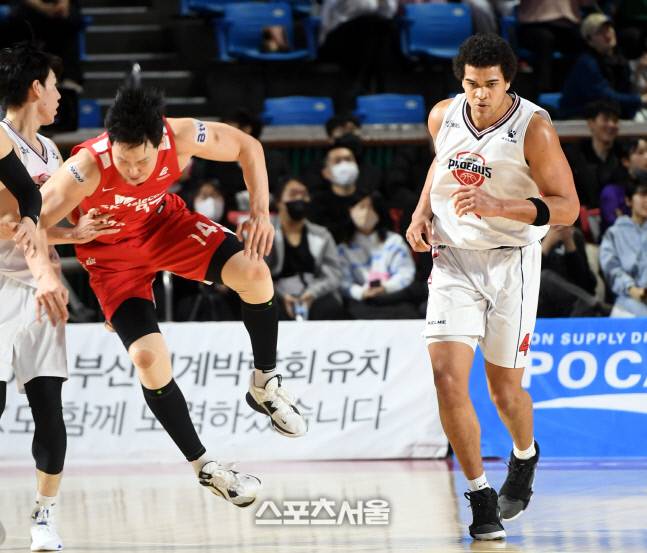 울산 현대모비스 프림이 7일 잠실학생체육관에서 열린 2022-2023 프로농구 서울 SK와 경기에서 상대 최부경을 밀고 있다.