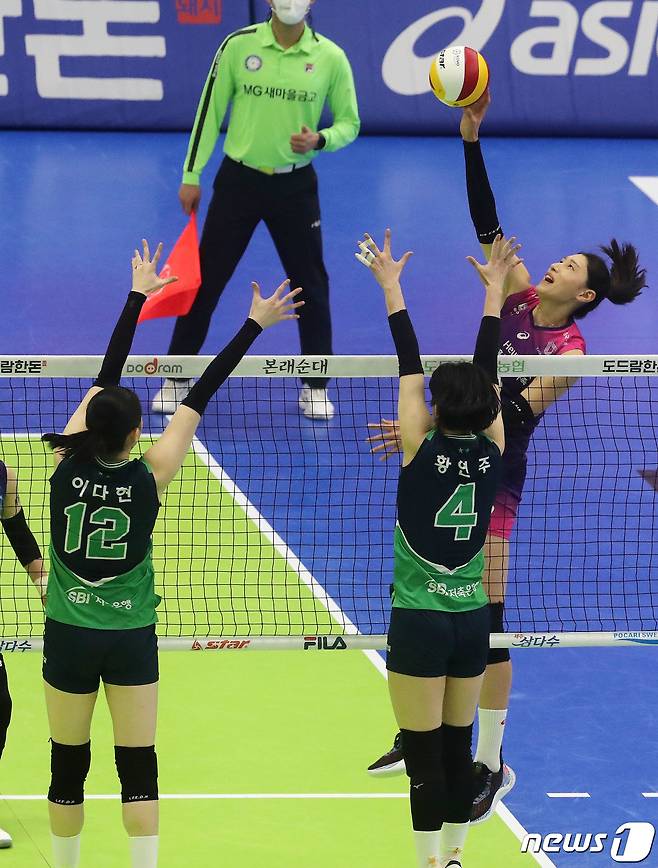(수원=뉴스1) 박세연 기자 = 7일 오후 경기 수원시 장안구 수원실내체육관에서 열린 열린 프로배구 '도드람 2022-2023 V-리그' 여자부 현대건설과 흥국생명의 경기에서 김연경(흥국생명)이 공격을 하고 있다. 2023.2.7/뉴스1